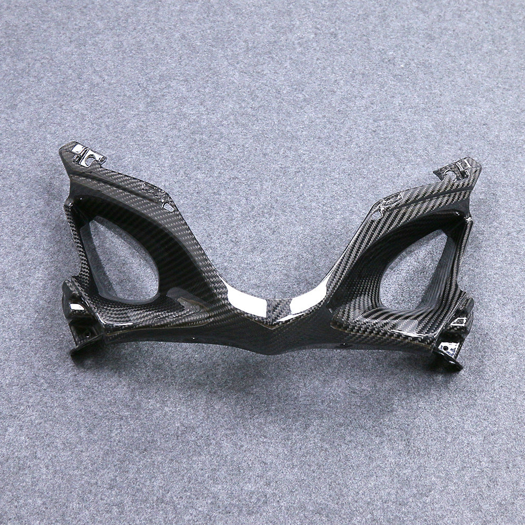 Cubierta decorativa para el faro frontal, fabricada en auténtica fibra de carbono, diseñada específicamente para la Suzuki GSX1300R Hayabusa. Esta pieza mejora el aspecto agresivo del carenado delantero, aportando una estética tipo competición, al mismo tiempo que proporciona una protección adicional contra rayaduras y suciedad.