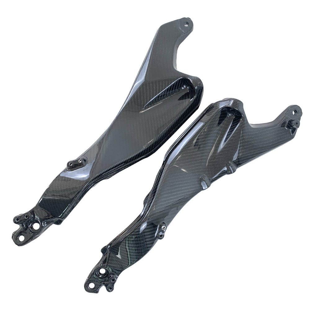Cubiertas decorativas fabricadas en auténtica fibra de carbono, diseñadas para los laterales del colín trasero de la Kawasaki Ninja H2 (modelos 2015 en adelante). Estas piezas sustituyen o cubren las tapas originales, aportando una estética más agresiva y deportiva, al tiempo que ofrecen protección adicional contra arañazos y desgaste.