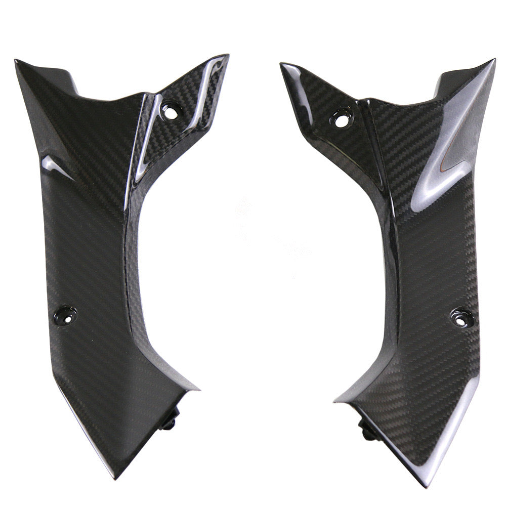 Revestimiento interior del carenado frontal fabricado en fibra de carbono auténtica, diseñado para enmarcar y proteger la zona del cuadro de instrumentos de la Yamaha YZF-R6. Aporta un toque visual limpio, deportivo y con acabado premium.