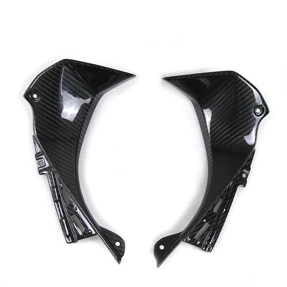 Paneles laterales fabricados en fibra de carbono auténtica, diseñados para cubrir la zona del cuadro de instrumentos y frontal del carenado de la Kawasaki ZX-6R. Aportan un estilo más agresivo y deportivo, a la vez que reducen el peso total del conjunto.